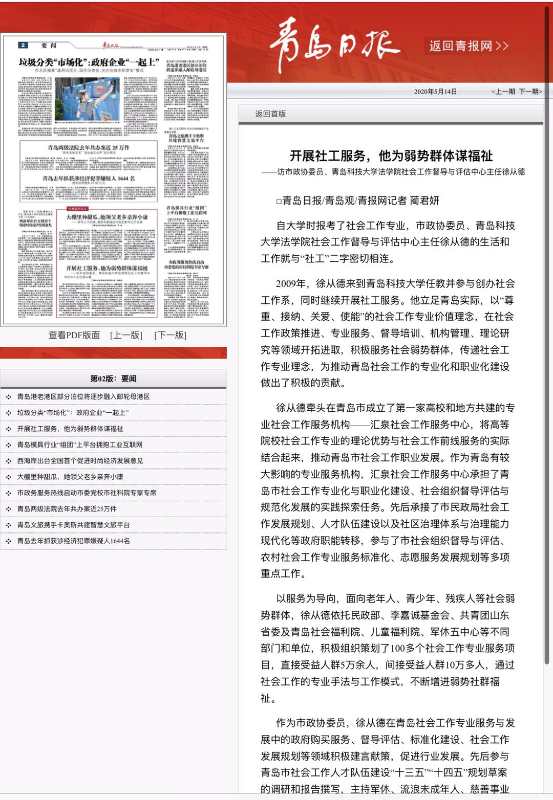 2009年,徐从德来到永利官网任教并参与创办社会工作系,同时继续开展社工服务。他立足青岛实际,以“尊重、接纳、关爱、使能”的社会工作专业价值理念,在社会工作政策推进、专业服务、督导培训、机构管理、理论研究等领域开拓进取,积极服务社会弱势群体,传递社会工作专业理念,为推动青岛社会工作的专业化和职业化建设做出了积极的贡献。