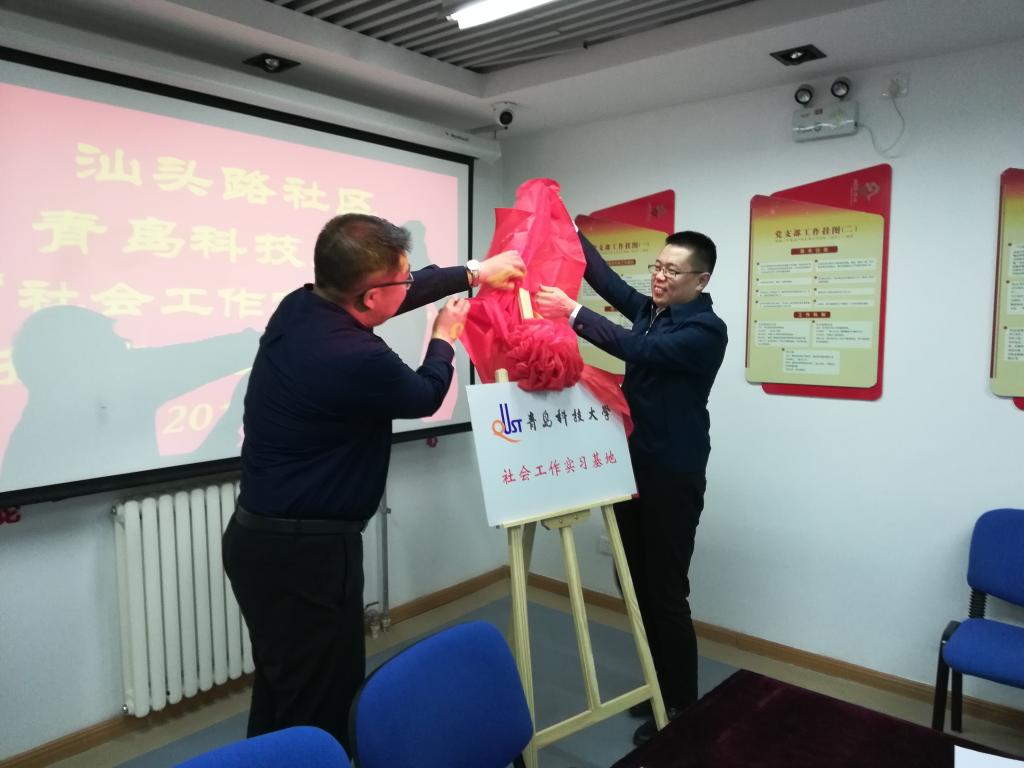 随后,盛鹏主任与朱敬义书记为“社会工作实习基地”揭牌,并见证双方签订实习协议。新的实习基地的拓展和建设为我校社会工作专业大学生及青年教师服务社区建设、参与社区治理、进行专业训练与理论研究提供了更多机会。我们也将在社区公益项目开发与指导等方面为汕头路社区提供支持帮助。