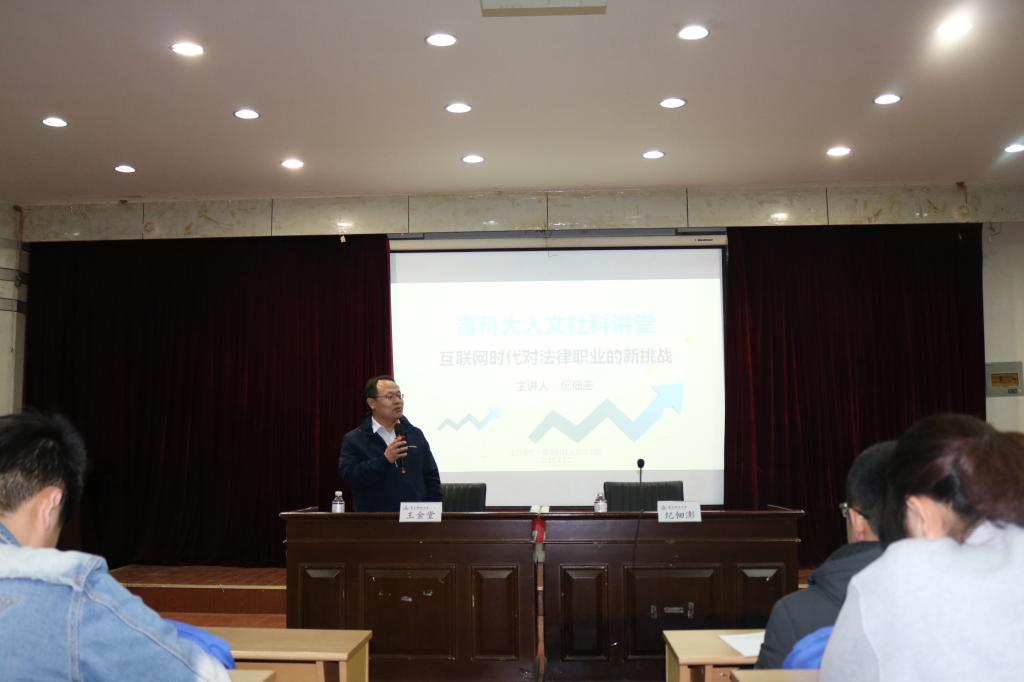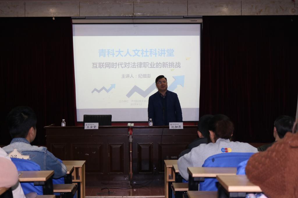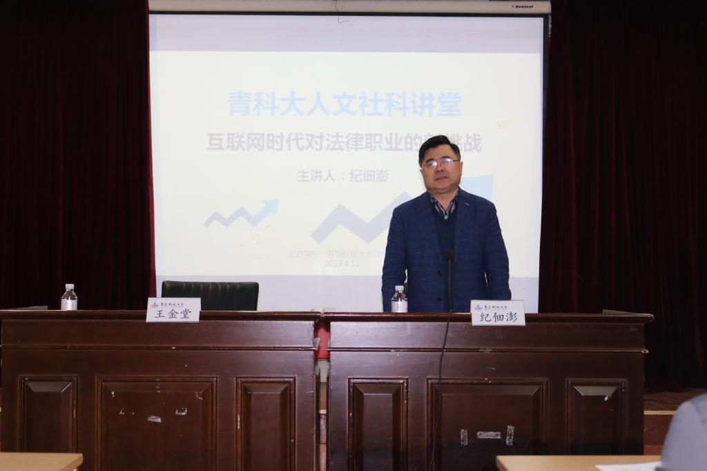 4月12日晚,永利集团88304举办青科大人文社科讲座:互联网时代对法律职业的新挑战,邀请了北京京佃律师事务所主任、中华全国律师协会刑事委员会委员、西南政法大学兼职教授纪佃澎主任主讲,讲座由永利集团88304院长王金堂教授主持。