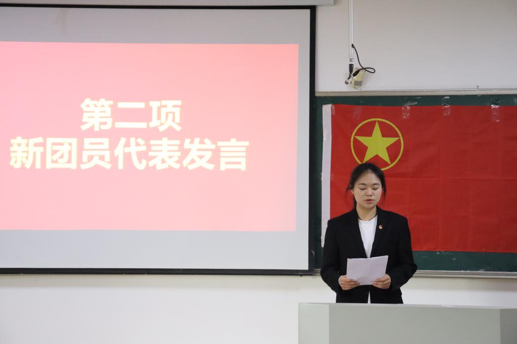社工201团支部孙源泉同学作为优秀团员代表上台发言,他分享了入团九年来自身的成长与收获,并希望全体团员能坚定信念,奋勇向前,一起树立远大理想。当五四青年的火炬传递到新时代青年手中时,作为共青团员应当形影不辍,履践致远,在学习和工作中起模范带头作用。希望新团员牢记自己的入团誓词,共同奋斗,积蓄力量,将光和热撒满大地,让团徽在胸前永远发光。