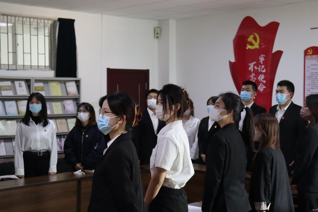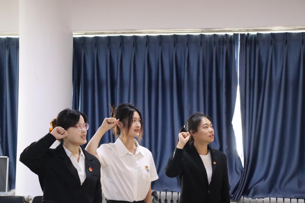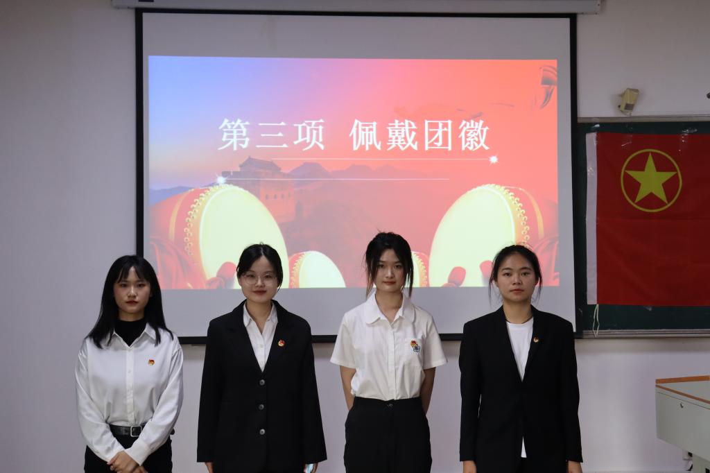法学201团支部刘佳逸同学为新发展团员张慧、李一航和韦昀同学佩戴团徽并进行合影留念。随后,新发展团员们面朝团旗举起右拳,庄严宣誓,胸前的团徽伴着坚定的誓词以此明确自己作为团员的责任与义务,更加坚定自己为共产主义事业而奋斗的决心。