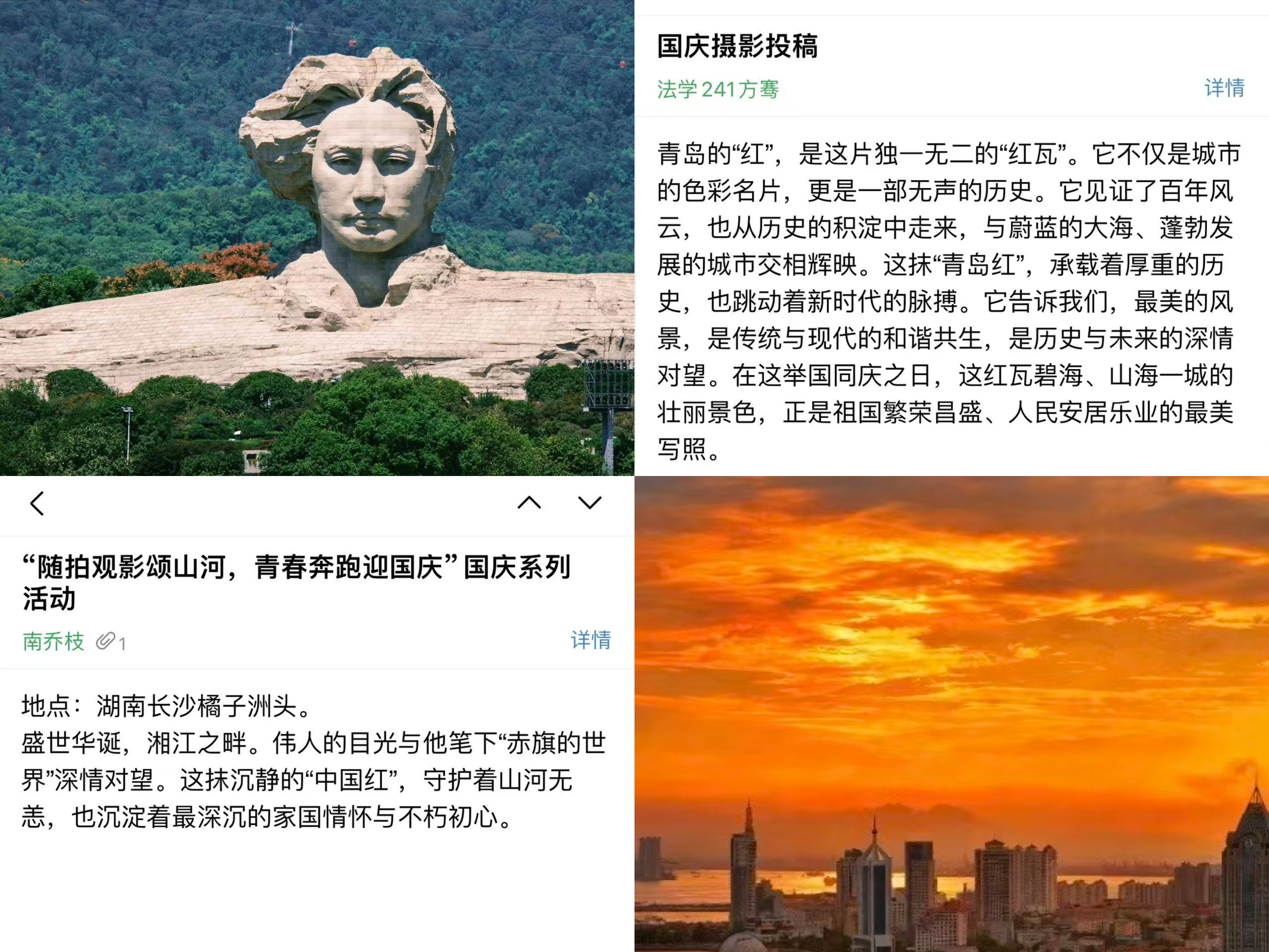 镜头定格中国红,光影传递家国情。中国红,是信仰的底色,更是时代的华章。永利集团88304开展“盛世华诞,我眼中的中国红”随手拍活动,鼓励学子以镜头为眼、以画面为语,捕捉身边的红色印记。从迎风飘扬的五星红旗到街头巷尾的大红灯笼,从城市地标的红色建筑到平凡生活的温暖瞬间,同学们用照片和文字传递真挚的情感,在光影交织中感悟家国同脉,在创作表达中坚定文化自信。
